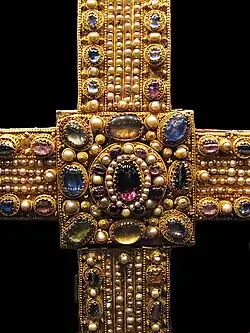 Die Vorderseite des Kreuzes ist mit Perlen und Edelsteinen in Hochfassungen (→ A-jour-Fassung) geschmückt (Crux gemmata). Die Rückseite zeigt in Niellotechnik ausgeführt das Lamm Gottes, das von den zwölf Aposteln umgeben ist, sowie die vier Evangelistensymbole auf den quadratischen Balkenschlüssen.