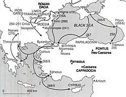 Nachdem bereits 262 Goten wieder die Donau überschritten hatten und anschließend sogar über den Hellespont nach Kleinasien übergesetzt hatten, wobei sie mehrere kleinasiatische Städte überfielen, griffen die „Skythai“ 267 erneut an und plünderten an der Nordküste Kleinasiens. Ebenfalls 267 fielen die Heruler mit Schiffen über das Marmarameer in die Ägäis und schließlich nach Griechenland ein. Es gelang ihnen, eine ganze Reihe von Städten zu erobern und zu plündern, darunter Byzantion, Argos und Athen. Bei ihrem Rückmarsch aus Attika wurden sie von einer örtlichen Miliztruppe besiegt. Während dieser Kämpfe soll sich der Geschichtsschreiber Dexippos ausgezeichnet haben; in neuerer Zeit wird aufgrund eines neuen Quellenfunds seine Teilnahme aber wieder stark bezweifelt und es eher für wahrscheinlich gehalten, dass ein anderer Mann namens Dexippos (wahrscheinlich Gnaeus Curtius Dexippus) an den Kämpfen dieser Zeit teilnahm (allerdings wohl gegen Goten 253/54 oder 262, also unabhängig vom Herulereinfall 267), zusammen mit dem Statthalter von Achaea, Marianus.[51] Ein Fragment aus den Skythika des Dexippos, das sich auf dieses Ereignis bezieht, ist erhalten geblieben. Es stellt eine der wenigen zeitgenössischen Quellenaussagen dar und ist inhaltlich aufschlussreich, denn hier wird auch ein starker griechischer Lokalpatriotismus und eine Rückbesinnung auf die griechische Geschichte greifbar: