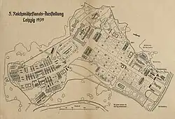 Die Stadt Leipzig stellte zu diesem Zweck den Veranstaltern im Südwesten der Stadt den Volkspark Kleinzschocher mit dem angrenzenden Küchenholz zur Verfügung. Auf insgesamt etwa 500.000 Quadratmetern Fläche[4] entstanden auf knapp 185.000 Quadratmetern zahlreiche Ausstellungsbauten.[5] Zu den größten zählten u. a. das Haus des Reichsnährstandes mit zehn Sonderschauen[6], das Haus der Fütterung[7], das Haus der Düngung[8], das Haus der Pflanzenzucht[9] sowie das Haus der Milch/Molkereikosthalle[10]. Zur Eröffnungsfeier am 4. Juni in der Ehrenhalle des Reichsnährstandhauses sprachen der Leipziger Oberbürgermeister Rudolf Haake, der sächsische NSDAP-Gauleiter Martin Mutschmann sowie der NS-Argrarpolitiker und Reichsbauernführer Walther Darré.