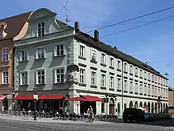 Die dreigeschossige Fassade ist mit einem Satteldach versehen und besitzt zur Maximilianstraße einen geschweiften Giebel mit Rustikaquadern an den Ecken. Über den beiden Eingangsbögen ist das Baujahr MDCXI zu lesen. Traufseitig an der Heilig-Grab-Gasse befinden sich 17 Fensterachsen. An der Südwestecke ist eine Figurennische eingelassen.
