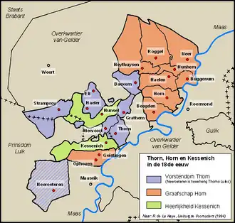 Westfälischer Reichskreis (Karte von Frederik de Wit III. u. a. – nach 1730; Stift Thorn ganz im Nordosten rechts der Maas)