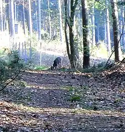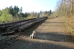 - Fast genau auf der Grenze[9] rund 42 Meter nördlich des trigonometrischen Punktes 302,0 steht auf etwas mehr als 300 m Höhe[10] die „Hütte auf dem Heidbrink“ oder kurz Heidbrinkhütte. Die kleine Schutzhütte befindet sich am Wittekindsweg (Kammweg) und damit am Europäischen Fernwanderweg E11. Ein Vorgänger der Hütte wurde im Jahr 1924 erbaut, eine Nachfolgehütte vor der Neuordnung, sprich vor 1973 erbaut,[11] beide noch in der Verantwortung der Gemeinde Ahlsen-Reinberg. Die Hütte wurde 1984, nun unter Lübbeckes Zuständigkeit, renoviert.[12]