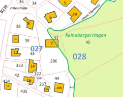 - ↑ Siehe Liegenschaftskarte entsprechender Adresse, frei verfügbar auf TIM-Online NRW - die Grenze des Reineberger Hagens wird z. B. im Maßstab 1: 1.742 als entweder blaue oder violett gebrochene Linie dargestellt