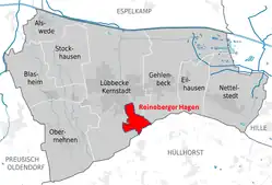 Der Reinberger Hagen, auch Reinbergerhagen, früher auch Reinebergischer Hagen, ist ein überwiegend bewaldetes Areal um den Berg Reineberg beziehungsweise um die ehemalige Burg Reineberg im Wiehengebirge auf dem Gebiet der Stadt Lübbecke. Der Reineberger Hagen, der auch Gelände der ehemaligen Reineburg einschließt, hat eine Fläche von 0,99 km². Bis zur Gebietsreform im Jahre 1973 gehörte er zur südlich gelegenen Gemeinde Ahlsen-Reineberg im damaligen Amt Hüllhorst und bildete einen Gebietskorridor dieser, der nach Norden bis an die Obere Tilkenbreite, quasi in Rufweite zur historischen Altstadt Lübbeckes, heranreichte.[1] Im Zuge der Gebietsreform fiel er dann an die Stadt Lübbecke. Der Gebirgskamm (genaugenommen der Kammweg) bildet seitdem die südliche Grenze zur Gemeinde Hüllhorst bzw. des Hüllhorster Ortsteils Ahlsen-Reineberg.[2][3] In der Südostecke grenzt der Reinberger Hagen an den Lübbecker Stadtteil Gehlenbeck, ansonsten liegt auch dessen Außengrenze komplett im Bereich der Kernstadt. Das Gebiet liegt zwischen 132 Meter über NN (im Norden bei der Oberen Tilkenbreite) und 311,6 Meter ü. NN (in der Nähe des Gipfels des Heidbrinks, der selbst aber knapp außerhalb des Gebiets liegt). Bis 1807 war der Reinberger Hagen ein Teil der Vogtei Schnathorst im Fürstentum Minden. Nach 1815 bis 1831 gehörte der er dann zum Kreis Bünde, der nach dessen Auflösung überwiegend in den Landkreis Herford aufging, mit Ausnahme des späteren Amtes Hüllhorst, das (mitsamt dem Reinberger Hagen) an den damals neu geschaffenen Kreis Lübbecke angegliedert wurde.
