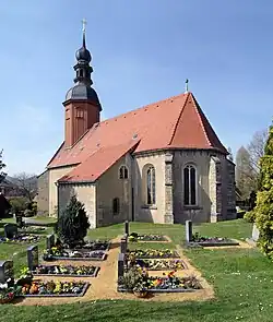 Ein als romanische Wehrkirche im 11./12. Jahrhundert errichteter Bau besteht nicht mehr.[2] Die Kirche aus dem 15. /16. Jahrhundert zeigt sich vor allem in ihrem Inneren im Stil des Barock. Diese Überformung fand zwischen 1675 und 1689 statt.[3] Sie war auch mit einer Erweiterung der Kirche verbunden.[3] Dabei entstand 1675 das geschmückte Westportal von Heinrich Weingarten, Pirna, und der Dachreiter über dem Westgiebel, den Haube, Laterne und Zwiebel zieren.[3]