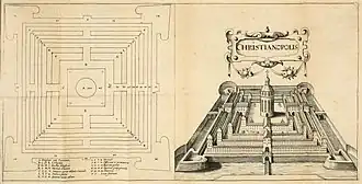 Christianopolis besitzt einen quadratischen Grundriss. Die Stadt ist von Mauern umgeben, in die in den Ecken und in den Mauern jeweils vier Türme integriert sind. Die Stadt ist in verschiedene Bereiche aufgeteilt.