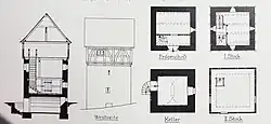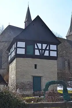 Das Gebäude liegt nördlich der katholischen Pfarrkirche St. Katharina an einem Hang. Es ist ein zweistöckiger, hochaufragender Bruchsteinbau auf fast quadratischen Grundriss über einem tonnengewölbten Keller und einem vorkragenden Fachwerkobergeschoss.[4]