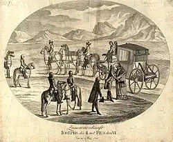 Beim Verlassen der Monarchie übergab er den 28 Personen, die ihn begleiteten, einen eigenhändig geschriebenen Befehl, in dem es u. a. heißt: „Niemand unterfange sich, auch den geringsten Fremden zu beschimpfen oder wohl gar zu schlagen. (…) Die Kutscher sind nicht anzutreiben, und kommen Wagen uns entgegen, dulde man es ohne Murren.“[73] Der Fuhrpark umfasste fünf halbverdeckte Kaleschen und zwei Küchenwagen, die zusammen 40 Pferde benötigten.[74]