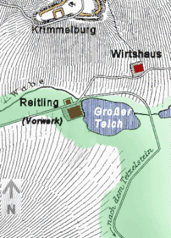 Im Grund des Reitlingstals am Bach Wabe gab es im Hochmittelalter eine mit Wällen befestigte Wasserburg, die der Bischof von Halberstadt innehatte. Bis Mitte des 13. Jahrhunderts war sie an die Ritter von der Asseburg belehnt, 1260 jedoch dem Deutschen Ritterorden übereignet. Der Orden verlegte seinen Verwaltungssitz schon kurze Zeit später in das wenige Kilometer entfernte Lucklum und machte aus der Burg ein Vorwerk. Dieser landwirtschaftliche Betrieb bewirtschaftete die Ackerflächen des Talgrundes und man hielt in den aus der Wabe angestauten Teichen Karpfen. Im Laufe der Zeit wurde die sumpfige Aue der Wabe urbar gemacht. Die nutzbare Ackerfläche des Tals reichte im Mittelalter nicht für die Anlage eines Dorfes aus. Heute bilden die alten Fachwerkgebäude einen Weidehof für Pferde. Sie wurden vermutlich im 18. Jahrhundert auf den Fundamenten der alten Burganlage errichtet. 1840 wurden die Wälle rund um das Vorwerk eingeebnet.[4]