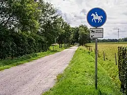 Auf öffentlichen Wegen und Straßen wird die Nutzung in der StVO geregelt. Das unten stehende blaue Schild weist einen Sonderweg aus, auf dem nur das Reiten erlaubt ist. Das Verbotsschild setzt sich aus dem Zeichen 250 und dem im § 39 Abs. 7 StVO aufgeführten Sinnbild „Reiter“ zusammen. Dort ist Reiten verboten, das Führen des Pferdes ist jedoch erlaubt.[4] In bewirtschafteten Forsten gelten landesrechtliche Regeln und vereinfachte Beschilderung. Zum Reiten dienen auf dem Land auch die unbefestigten Sommerwege entlang von befestigten Straßen.