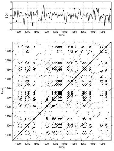 - ↑ a b c d N. Marwan, M. C. Romano, M. Thiel, J. Kurths: Recurrence Plots for the Analysis of Complex Systems. In: Physics Reports. 438. Jahrgang, Nr. 5–6, 2007, S. 237, doi:10.1016/j.physrep.2006.11.001, bibcode:2007PhR...438..237M (englisch).