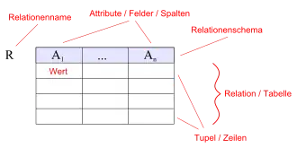 Eine relationale Datenbank kann man sich als eine Sammlung von Tabellen (den Relationen) vorstellen, in welchen Datensätze abgespeichert sind. Jede Zeile (Tupel) in einer Tabelle ist ein Datensatz (record). Jedes Tupel besteht aus einer Reihe von Attributwerten (Attribute = Eigenschaften), den Spalten der Tabelle. Das Relationenschema legt dabei die Anzahl und den Typ der Attribute für eine Relation fest. Das Bild illustriert die Relation R mit Attributen A1 bis An in den Spalten.