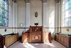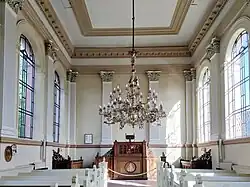 Die Kirche kommt entsprechend den o. g. liturgischen Empfehlungen der Remonstranten ohne Altar und ohne großes Kreuz aus. Eine erhöhte Mittelkanzel ist zentral auf die Gemeinde ausgerichtet. Auf der Empore über dem Eingangsbereich ist eine Orgel installiert, die 1869 vom Orgelbauer Johann Färber gefertigt worden ist. Im Jahr 2011 erfolgte eine umfassende Restaurierung durch den Orgelbau Jehmlich.[4]