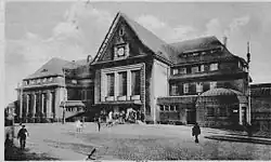 1897 wurde schließlich die Lücke zwischen Solingen Süd und Remscheid geschlossen, 1907 wurde diese Strecke zweigleisig ausgebaut. Somit besaß der Remscheider Bahnhof Bahnverbindungen in vier Richtungen (sowie zusätzlich via Lennep in Richtung Opladen). Am 10. August 1911 konnte ein repräsentativer steinerner Neubau des Empfangsgebäudes eingeweiht werden, der das vorhandene, wegen seines beschränkten Raumangebotes im Volksmund Zigarrenkiste genannte Gebäude ersetzte. Die Hastener Strecke endete weiterhin auf einem Stumpfgleis auf der Westseite des Gebäudes, die bisherigen zwei Gleise wurden durch einen Mittelbahnsteig und einen Hausbahnsteig mit dazwischen liegender Fußgängerbrücke und einem Tunnel zum Bahnpostamt ergänzt. Der Neubau wurde durch den Wiederaufbau eines Teils der Bahnsteighalle des Bahnhofes Elberfeld-Döppersberg ergänzt und die Güterabfertigung 1911 auf die gegenüberliegende südliche Seite des Gleisfeldes (Ladestraße) verlegt.[1]
