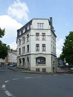 Das Gebäude besitzt einen unregelmäßigen Grundriss. Während der südliche Gebäudetrakt eine trapezförmige, mit einer zur Straßenkreuzung hin abgestumpften Front aufweist, bildet der etwas abgewinkelte und sich an die Nachbargebäude anschließende Teil des Hauses ein Rechteck. An der Schnittstelle beider Gebäudeteile befindet sich ein Mittelrisalit mit Ziergiebel im Mansardbereich.