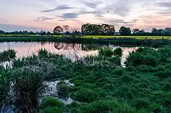 Feuchtwiesen sind durch Entwässerung und Umwandlung in Acker- oder Weideland fast völlig verschwunden. Es handelt sich hierbei um gehölzfreie Biotope auf feuchten bis nassen Standorten. Periodisch überschwemmte Auenwiesen, bieten nicht nur zahlreichen Vögeln und Insekten einen Lebensraum, sondern leisten darüber hinaus einen präventiven Beitrag zum Hochwasserschutz, da sie große Wassermengen speichern und so die Fließgewässer entlasten.[31]