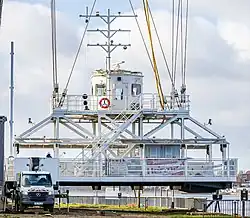 Die neue Schwebefähre wurde am 4. März 2022 offiziell in Betrieb genommen.[16] Sie ist 15,5 Meter lang und 10 Meter breit, hat ein Eigengewicht von 45 Tonnen und bietet Platz für 100 Fußgänger. Als Ladung sind maximal 15 Tonnen, verteilt auf bis zu vier Fahrzeuge (davon eines mit einem Gewicht von bis zu 7,5 t), zulässig. Die Gondel hängt an zwölf Seilen unter einer Stahlkonstruktion, die den Untergurt der Brücke U-förmig umfasst und mit insgesamt acht Rädern auf zwei Schienen rechts und links des Brückenträgers läuft. Vier Elektromotoren mit je 30 kW Leistung treiben die Räder an. Die Inbetriebnahme des Neubaus mit neuer und moderner Technik ging mit einigen technischen Problemen einher.[17][18] Seit März 2025 ist die Fähre aufgrund notwendiger Reparaturarbeiten erneut für mehrere Monate geschlossen.[19]