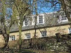 Die rückwärtige Fassade ist ebenfalls fünf Achsen weit. Wie auch an der Frontseite sind die Kanten mit Ecksteinen abgesetzt. Die Nordwestseite ist drei Achsen weit. Das abschließende Plattformdach ist mit grauem Schiefer eingedeckt. Die heraustretenden Gauben sind mit Zwillingsfenstern gestaltet. Das Mauerwerk der flankierenden Pavillons besteht aus Bruchstein. Sie schließen mit Walmdächern.[1]