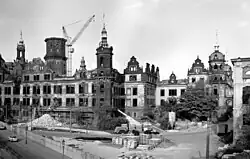 Infolge der Luftangriffe auf Dresden gegen Ende des Zweiten Weltkriegs brannte am 13. Februar 1945 das Schloss bis auf seine Grundmauern nieder, wobei auch das Grüne Gewölbe beschädigt wurde. Das Zinn der Dächer schmolz durch die hohen Temperaturen. Der Hausmannsturm verlor seine Spitze; der Turmstumpf wurde 1946 notdürftig abgedeckt. Nach dem Krieg wurde in einem Teil der Kellergewölbe einige Jahre lang eine Pilzzucht betrieben. Am 13. Februar 1985, dem Wiedereröffnungstag der Semperoper, stellte der damalige Staatschef Erich Honecker in Aussicht, dass der Außenbau des Schlosses 1990 wiederhergestellt sein würde. Allerdings war 1989 noch nicht einmal der Westflügel fertig.