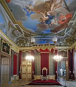 - Audienzgemach mit dem Deckengemälde „Allegorie auf die weise Regierung des Hauses Wettin“ (urspr. von Louis de Silvestre, 1719[10]).