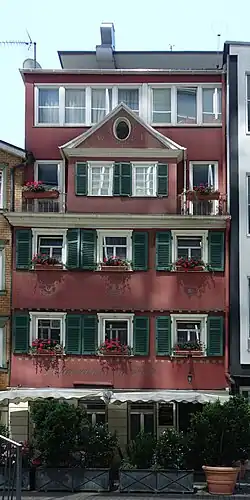 Das schmale Gebäude der „Restauration zur Kiste“ besteht aus 5 Stockwerken und 3 Fensterachsen. Es wurde 1740–1760 als Wohnhaus mit 2 Stockwerken erbaut. Das Haus ist in einem rötlichen Farbton verputzt. Der Verputz ist mit weißen Schmuckornamenten in Sgraffito (Kratzputz) verziert. Über dem Erdgeschoss trägt das Haus den weißen Sgraffito-Schriftzug „Restauration zur Kiste“. Die weiß gerahmten Fenster tragen grüne Klappfensterläden.