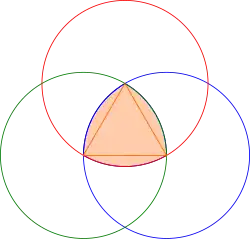 Um ein Reuleaux-Dreieck zu konstruieren, fängt man mit einem gleichseitigen Dreieck an. Um jeden Eckpunkt wird ein Kreis gezeichnet, der durch die beiden jeweils gegenüberliegenden Eckpunkte geht. Der Durchschnitt (d. i. die gemeinschaftliche Fläche) der drei Kreise bildet das Reuleaux-Dreieck.
