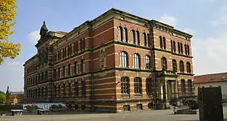 Das Schulgebäude ist ein viergeschossiger massiver Klinkerbau mit Satteldach, der dem preußischen Schultyp entspricht. Das Hauptgebäude hat eine Grundfläche von 65 × 25 Metern. Das Portal der Schule wird von Säulen aus Seeberger Sandstein flankiert. Die zugehörige Turnhalle mit einer Grundfläche von 25 × 15 Metern wurde ebenfalls im Jahr 1900 erbaut.