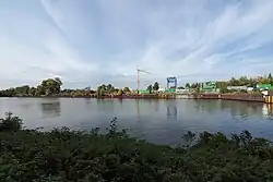 Der Hafen der ehemaligen Zeche Hugo besteht aus einem zum Kanal hin offenen Hafenbecken, das rückwärtig mit einer Spundwand abgetrennt ist. Die früheren Hafenanlagen sind vollständig entfernt. Im Hintergrund sieht man eine der Baustellen für den neuen Emscherkanal.