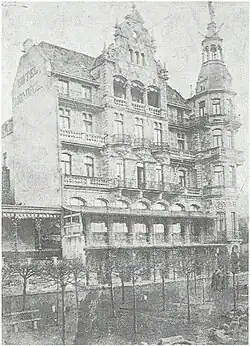 Der Bau des Hotels, das zunächst unter dem Namen Zum Goldenen Drachen eröffnen sollte, begann im Jahre 1893. Bauherr und Besitzer war der ortsansässige Gastronom Hubert Wilhelm Wagner, Entwurf und (teilweise) Ausführung lagen in den Händen des Kölner Architekten Josef Seché.[2][3][4] Am 30. September 1893 stürzte die Nordseite des Rohbaus ein, wobei vier Maurer ums Leben kamen.[5][6] Die Fertigstellung des Hotels, dessen Ausführung nunmehr dem Bonner Architekten Johann Schwister übertragen wurde[7], verzögerte sich in der Folge erheblich. Es nahm am 9. Mai 1895, nunmehr als Hotel Monopol, offiziell seinen Betrieb auf. Zu dieser Zeit war das fünfgeschossige Bauwerk das mit Abstand höchste und imposanteste am Königswinterer Rheinufer. Zu den Gästen gehörte neben dem gehobenen Bürgertum auch der Adel und europäische Hochadel – so wurde 1899 im Hotel Monopol die 40. Geburtstagsfeier von Kaiser Wilhelm II. ausgerichtet. 1903 erfolgte eine Umbenennung in Hotel Monopol-Metropol. Nach einem Besitzerwechsel im Jahre 1911 wurde im Erdgeschoss ein Wiener Kaffeehaus eröffnet.[8]