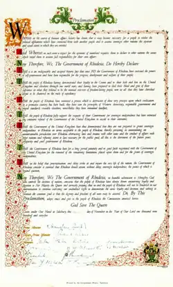 Südrhodesien erklärte als bis dahin sich selbst regierende britische Kronkolonie am 11. November 1965 einseitig die Unabhängigkeit von Großbritannien. Premierminister Ian Smith sandte das Telegramm an den britischen Premier Harold Wilson um 13 Uhr Ortszeit (11 Uhr in London), genau in dem Moment, an dem in London während zweier Schweigeminuten der Opfer der beiden Weltkriege gedacht wurde. Daraufhin verließ der Hohe Kommissar John Baines Johnston das Land. International wurde die Unabhängigkeitserklärung von keinem Staat offiziell anerkannt, allerdings arbeiteten die benachbarten Regionalmächte Südafrika und Portugal mit der rhodesischen Regierung fortan eng zusammen. Zunächst wurde Elisabeth II. zur Königin von Rhodesien ausgerufen. Diesen Titel nahm die Königin nicht an. Der seit 1959 als ihr Vertreter amtierende rhodesische Generalgouverneur Sir Humphrey Gibbs wurde, nachdem er seine Ablehnung der einseitigen Unabhängigkeitserklärung kundgetan hatte und versucht hatte, die Regierung Smith zu entlassen, von dieser von nun an ignoriert. Als neues, die Königin vertretendes Staatsoberhaupt mit dem Titel „Officer Administering the Government“ wurde vom rhodesischen Premierminister der Vizepremier und Außenminister Clifford Dupont eingesetzt.