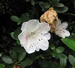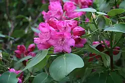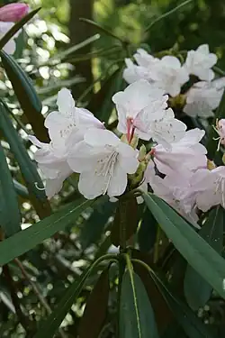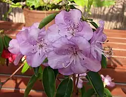 Die Rhododendren (Singular laut Duden: der oder das Rhododendron,[1] von griechisch ῥόδον = rhodon „Rose“ und δένδρον = dendron „Baum“)[2] sind eine Pflanzengattung innerhalb der Familie der Heidekrautgewächse (Ericaceae).[3][2][4] Sie ist mit über 1000 Arten[5][3][2] eine vergleichsweise große Gattung. Eine Vielzahl von Sortengruppen und eine fast unüberschaubare Zahl von Sorten, welche teils Hybriden, teils nur vegetativ vermehrbare Ausleseformen (sogenannte Sports) sind, werden als Zierpflanzen in Parks sowie Gärten und als Zimmerpflanzen verwendet.[6]