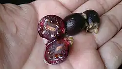 Die eiförmigen bis rundlichen, vielsamigen Beeren, die Ähnlichkeiten zu Heidelbeeren aufweisen, sind im reifen Zustand dunkelviolett und essbar. Unreife Früchte sind grün. Sie haben eine Länge von 10 bis 15 Millimetern und sind mit einem haltbaren Kelch gekrönt. Sie besitzen 40 bis 45 Samen, die etwa 2 Millimeter lang und abgeflacht sind.[3]