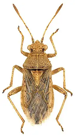 Die Grundfarbe des Körpers ist variabel gelbbraun bis rot. Das 6. Tergit zeigt fünf gelbliche Flecken auf schwarzem Grund, drei größere am Vorderrand und zwei kleinere in den Hinterwinkeln. Die Adern des Coriums weisen stets schwarze oder braune Punkte auf. Das Corium ist in der basalen Hälfte gelbbraun bis braun. Die Färbung und Zeichnung des Connexivum ist variabel; es kann einfarbig hell sein, einen dunklen Punkt in der Mitte jeden Segments aufweisen oder alternierend dunkle und helle Flecken zeigen.