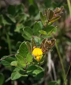 Die wechselständig und spiralig oder zweizeilig an der Sprossachse verteilt angeordneten Laubblätter sind in Blattstiel und Blattspreite gegliedert. Die krautigen bis ledrigen Blattspreiten sind unpaarig gefiedert.[2] Es sind meist drei Fiederblättchen vorhanden, die Blattspreiten sind also meist dreiteilig oder es ist nur die Endfieder vorhanden. An den Fiederblättern ist ein Pulvinus vorhanden. Die flachen Fiederblätter sind bei einer Länge von 1 bis 5,5 Zentimetern rhombisch, eiförmig, verkehrt-eiförmig, oder kreisförmig mit keilförmiger oder gerundeter Basis und glatten, flachen Rand. Die Unterseite der Fiederblättchen ist meist drüsig punktiert[3], mit sitzenden Drüsen. Die zwei seitlichen Fiederblätter sind asymmetrisch und die Stielchen der Endfiedern sind mehr als viermal so lang wie die der seitlichen[3]. Es ist Netznervatur vorhanden. Wenn Nebenblättchen der Fiederblätter vorhanden sind, dann sind sie winzig und borstenförmig. Die zwei haltbaren oder früh abfallenden Nebenblätter sind oft linealisch-lanzettlich, untereinander frei und nicht mit dem Blattstiel verwachsen.[1][2]