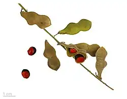 Die kleine, bei einer Länge von 2 bis 2,5 cm und einer Breite von 0,8 bis 1,8 cm längliche, flaumig behaarte Hülsenfrucht enthält nur selten ein oder meist zwei Samen und ist zwischen den Samen verengt; sie öffnet sich bei Reife. Die bei einem Durchmesser 5 bis 6 mm fast kugeligen Samen sind glänzend schwarz und um das Hilum herum leuchtend rot; die Farbbereiche können einen unterschiedlichen Anteil aufweisen.[3]