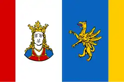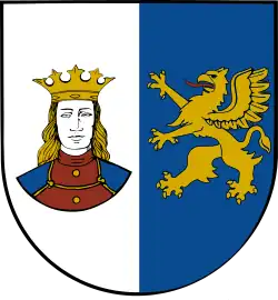 Blasonierung: „Gespalten; vorn in Silber ein hersehendes, rot gekleidetes, gold behaartes und gekröntes Brustbild eines Mannes mit goldbesäumtem blauem Umhang, hinten in Blau ein aufgerichteter, rot gezungter goldener Greif.“[16]