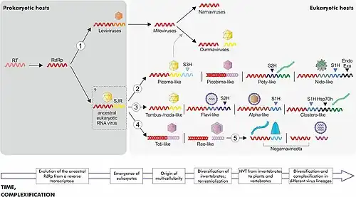 In beiden Reichen der Riboviria zeigt sich eine verwandtschaftliche Beziehung der RNA-abhängigen Polymerase zu den Reversen Transkriptasen (RTs) von RT-kodierenden Introns der Gruppe II, und Retrotransposons (per RT selbstreplizierende DNA-Sequenzen, die sich in andere Teile desselben DNA-Moleküls integrieren). Die revers transkribierenden Viren der Pararnavirae scheinen sich nur einmal aus einem solchen Retrotransposon entwickelt zu haben. Der Ursprung der RdRPs der Orthornavirae ist aufgrund mangelnder Informationen weniger klar, aber es wurden zwei Szenarien vorgeschlagen: Das wahrscheinlichste Szenario ist, dass die RdRPs der Orthornavirae aus der Reversen Transkriptase eines bakteriellen Gruppe-II-Introns in der Entwicklungsgeschichte des Lebens bereits kurz vor der Entstehung von Eukaryoten (Eukaryogenese) entstanden sind.[4][13][14] Die andere Möglichkeit ist, dass die RdRPs der Orthornavirae bereits vor dem letzten universellen gemeinsamen Ahn (LUGA; engl. last universal common ancestor, LUCA) entstanden sind und dass sie den Reversen Transkriptasen der Retroelemente vorausgingen.[15][16]