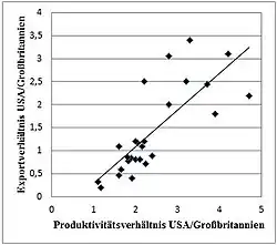 Die nebenstehende Abbildung veranschaulicht Ricardos Theorie, dass der Handel nicht von absoluten, sondern von relativen Vorteilen anhängt. So geht aus der Abbildung hervor, dass amerikanische Unternehmen in einer Branche umso mehr exportieren, je höher dort ihr relativer Produktivitätsvorteil ist.
