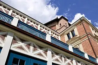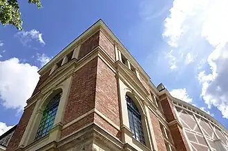 Zuschauerraum und Bühnenhaus sind in Fachwerk-Bauweise ausgeführt, wobei das ursprüngliche Holzfachwerk bei Renovierungen ab den 1960er Jahren durch ein Tragwerk aus Beton und Stahl ersetzt wurde. Der Außenbau ist weitgehend aus rotem Ziegelstein und kommt fast ohne dekorativen Schmuck aus, was dem Haus auch die despektierliche Bezeichnung „Scheune“ eingetragen hat. Mit der Erinnerung an „flüchtig gezimmerte Festhallen“[36] sollte nach Wagners Worten ein volkstümlicher Eindruck erweckt und eine „Nachahmung des ausländischen Wesens“ vermieden werden.[37]