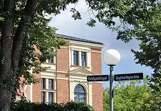 Auf dem Grünen Hügel und seinem zum Festspielhaus ansteigenden Gelände sind wetterfeste Informationstafeln aufgestellt, die unter der Überschrift verstummte Stimmen zahlreiche Sängerinnen und Sänger von Wagner-Rollen in einer Kurzbiografie mit Foto darstellen. Im Richard-Wagner-Park wurden zudem eine Bronzebüste für Richard Wagner aufgestellt und 1979 auf der durch die Zufahrtsstraße unterbrochenen Parkseite eine Büste für Cosima Wagner, gestaltet von Arno Breker. Auf dem weiter ansteigenden Hügel erhielt im Jahr 1996 eine vom Japaner Setsuzo Matsusaka geschaffene und gestiftete Kunstskulptur Der Traum ihren Platz, auf dessen Postament eine handschriftliche Notiz von Richard Wagner eingraviert ist.[45] Der Platz vor dem Eingangsbereich erhielt den Namen Wolfgang-Wagner-Platz, die direkt auf das Haupthaus zulaufende Straße heißt Siegfried-Wagner-Allee. Die herumführenden Straßen tragen die Bezeichnungen Wotanstraße, Parsifalstraße, Tannhäuserstraße, Rheingoldstraße und nehmen damit Bezug auf Wagners Werke.