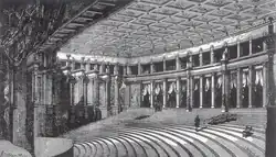 Der Zuschauerraum ist von Scherwänden flankiert. Diese setzen sich in einem doppelten Proszenium fort, das angelegt wurde, um den optischen Eindruck zu erwecken, die Bühne sei weiter entfernt, als sie es in Wirklichkeit ist.