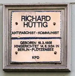 - An Richard Hüttig erinnert seit 1950 der zur Hinrichtungsstätte Plötzensee führende Hüttigpfad, ebenfalls im damaligen Verwaltungsbezirk Charlottenburg.[2] Nach Rückbau der Verkehrsführung ist dieser kein Straßenland mehr, trägt jedoch weiterhin die Benennung, die als erste Widmung in Charlottenburg-Nord vorgenommen wurde.