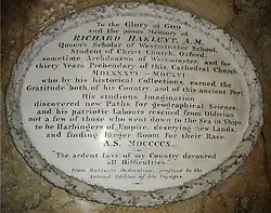 Die Gedenktafel für Richard Hakluyt in der Kathedrale von Bristol aus dem Jahr 1910 hat die folgende Aufschrift (mit deutscher Übersetzung):