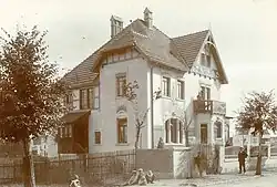 Villa Baldur mit Baumeister Gänzel sowie Werbeanzeige auf der Einfriedung vom Baumeister