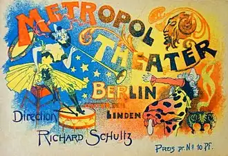 So brachte Schultz beispielsweise in der Revue Eine wilde Sache echte Araber „nebst Eseln und Kamelen“ auf die Bühne.[7] Aber auch Sozialaristokraten, ein Drama von Arno Holz, hatte unter Holz’ Regie als selbstfinanzierte Produktion am 15. Juni 1897 dort seine Uraufführung. Max Reinhardt spielte dabei die Rolle des Bellermann.[8]