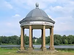 2000 wurde im neuen Teil am Westufer des Spielmannteichs ein achtsäuliger Rundtempel aufgestellt. Dieser stammte ursprünglich aus Salzdahlum aus der ehemaligen Schlossanlage, von dort gelangte er nach Braunschweig und später nach Triangel bei Gifhorn in den Gutspark. Als Geschenk aus dem Landkreis Gifhorn kam er wieder nach Braunschweig und wurde in eine der Blickachsen des Schlosses gesetzt. Zuvor hatte an dieser Stelle ein Holzpavillon gestanden. Zum Schenkungsvertrag gehörte die Verpflichtung, dass die Stadt Braunschweig die Kosten für den Abbau, den Transport und die Restaurierung übernimmt.[3] Mit der Unterstützung von Braunschweiger Handwerkern wurde der Säulentempel restauriert.
