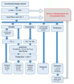 Für Behälter und Rohrleitungen muss anhand des Gefahrenpotential eine Kategorie ermittelt werden. Die Kategorien reichen auf steigend mit dem Gefahrenpotential den Wert 1 bis 4. Für Druckgeräte unterhalb von bestimmten Grenzwerten liegen, muss nach Art. 4(3) die gute Ingenieurpraxis angewandt werden. Zur Ermittlung der Kategorie sind folgende Parameter relevant: