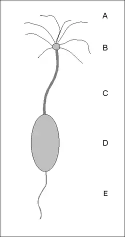 A: Zilien, B: Vesikel, C: Dendrit, D: Soma, E: Neurit.