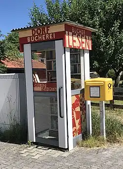 - ↑ Andreas Seiler: Ungewöhnliches Ferienprojekt in Riegsee: Mini-Dorfbücherei in Telefonzelle: Lesefreuden auf einem Quadratmeter. Münchner Merkur, 24. August 2016, abgerufen am 5. Juli 2019.