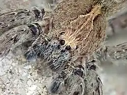 Die Männchen haben je einen pro- (vorne seitlichen) und einen retrolateralen (hinten seitlichen) Stachel an den Patellae aller Beinpaare, die Weibchen nur an denen der beiden hinteren. An den Tibien der beiden vorderen Beinpaare befinden sich ventral 4 und zusätzlich an denen des zweiten sowie des vierten jeweils drei Paare kurzer Stacheln. Den Weibchen fehlen überdies dorsale und laterale Stacheln an den Tibien der beiden vorderen Beinpaare, dafür ist eventuell ein kurzer prolateraler ausgeprägt. Es befinden sich je zwei prolaterale, zwei oder drei retrolaterale und zwei oder drei dorsale Stacheln an allen Tibien bei den Männchen und an denen der beiden hinteren Beinpaare der Weibchen. Die Metatarsen der beiden vorderen Beinpaare verfügen ventral über jeweils vier bis sieben Stacheln, die Männchen haben zusätzlich je drei prol- und drei retrolaterale sowie eventuell zwei kleine dorsale apikale Stacheln. Die Metatarsen beider hinterer Beinpaare verfügen je ventral über paarige apikale und bis zu 10 alleinstehende und überdies drei bis fünf prolaterale, drei bis vier retrolaterale und drei bis sechs dorsale Stacheln. Die Tarsen der beiden hinteren Beinpaare besitzen ventral jeweils einen bis 16 kurze Stacheln, die jedoch durch die dichten Scopulae verdeckt werden. Von den dort bei den Männchen nicht vorhandenen Tarsen fällt die Bestachelung der Pedipalpen bei beiden Geschlechtern gleich aus. Dort sind beim Weibchen jeweils zwei oder drei pro- und ein oder zwei retrolaterale Stacheln, bei den Männchen an den dort anstelle der Tarsen befindlichen Bulbus (männliches Geschlechtsorgan) keiner oder maximal zwei laterale Stacheln. An den Femora sind je vier bis sechs dorsale sowie ein pro- und ein retrolateraler, an den Patellae ein prolateraler und an den Tibien zwei pro- und ein retrolateraler Stachel befindlich.[3]
